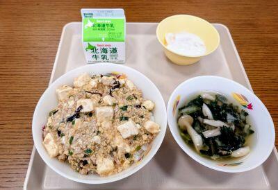 麻婆豆腐丼 しめじとほうれん草の味噌汁 フルーツヨーグルト